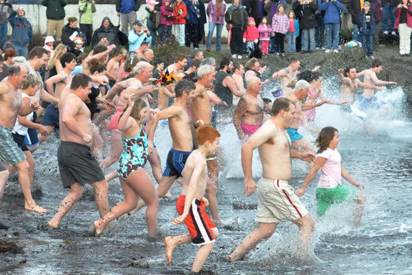 Over 100 hardy revelers participated in the 22nd annual Polar Bear Dip on Hollywood beach in Port Angeles Friday morning. There was no snow or seaweed on the beach as there has been in years past. Dan Weldon printed and distributed certificates to all those who participated in the event.