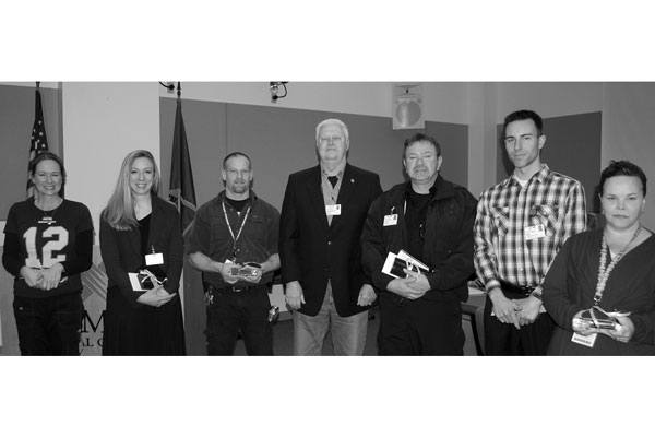 Olympic Medical Center Chief Executive Officer Eric Lewis and the medical center’s board of commissioners recognized six employees from across the organization at its Feb. 5 board of commissioners meeting. They are, from left, from left, Ronda Anderson, espresso operator; Lacey Wilson, RN; Rob Gale, construction carpenter; Jim Leskinovitch, 2014 board president; David Rudzinski, security officer; Michael Loucks, laboratory customer service supervisor; and Randi Lelle, medical assistant. In the past few months, several managers also have received recognition by Lewis. Holly Wickersham, operations manager for Olympic Medical Physicians; Graciela Harris, director of nutrition services; and most recently Tanya Rutherford, director of the medical/surgical/pediatric unit received recognition in November, December and January, respectively. Submitted photo
