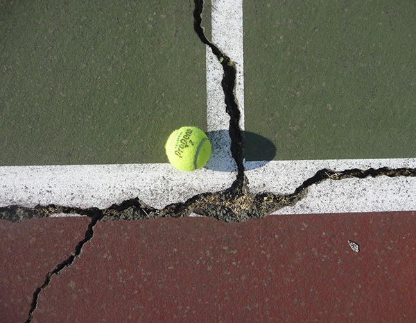 Have repairs been attempted? They certainly have — by the school maintenance staff. But the repairs failed. The cracks are severe. The work needs to be done by tennis court specialists. Even senior citizens attempted to make repairs.