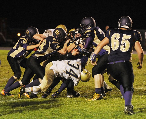 The Wolves and Knights battled to a sloppy, scoreless first quarter that featured two Knights fumbles and a Sequim turnover on downs. In the second quarter, after forcing a Bremerton punt with five minutes until halftime, Sequim fumbled on its own 5-yard line, setting up Calvin Cardwell’s 3-yard plunge with 3:51 left in the half.