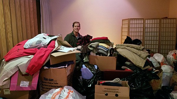 Drennan & Ford Funeral Home and Crematory co-owner Steve Ford recently looked over hundreds of pieces of cold weather clothing donated by Clallam County residents as part of the Drennan & Ford Funeral Home’s recent “Sweaters for Veterans” collection drive.