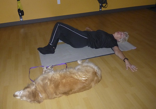 Leilani Sundt and her dog Crystal do some yoga stretches during a recent Fit4life fundraiser for Welfare for Animals Guild. The Feb. 20 event raised neatly $350 for the nonprofit dog rescue organization based in Sequim