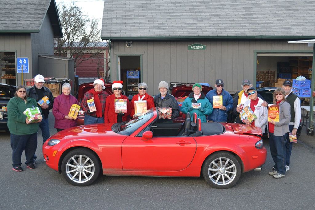 Members of the Olympic Peninsula Chapter of Club Miata filled their sporty cars on Thursday, Dec. 8, to make a sizable donation to the Sequim Food Bank, 144 W. Alder St. Vicki Burr-Chellin, coordinator of the club, said members of the club used to hold an annual white elephant gift exchange but decided to donate food instead. Larry and Darlene McCaffrey coordinated the food drive. The club, in operation for three years, features 45 members from Silverdale to Forks with 29 cars.The Sequim Food Bank holds its Christmas turkey basket giveaway from 9 a.m.-1 p.m. Friday-Saturday, Dec. 16-17, and noon-4 p.m. Monday, Dec. 19. For more information, call 683-1205. Sequim Gazette photo by Matthew Nash