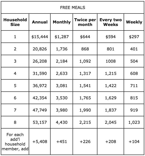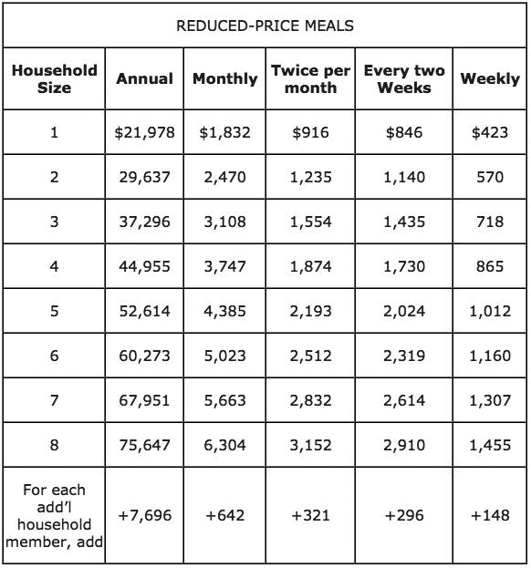 The income eligibility guidelines listed below are used to determine the eligibility of children to receive free or reduced-price meals or free milk. Washington State legislation pays the cost of lunch for public school students eligible for reduced-price meals in grades K‒3 and the cost of breakfast for public school students eligible for reduced-price meals in grades K-12.