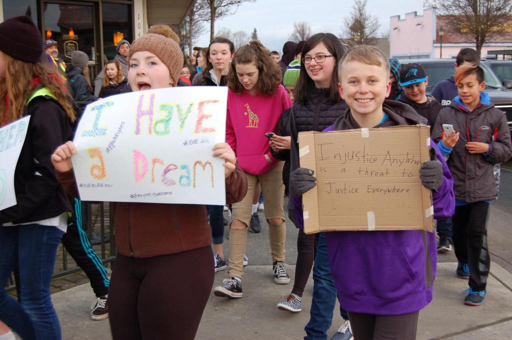 The words of Martin Luther King Jr. were found on colorful posters made by middle school students as they walked the streets of downtown Sequim on Friday, Jan. 13, to demonstrate their support for Martin Luther King Jr. Day.