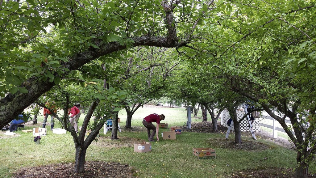 Volunteers and Dan Littlefield, food recovery program coordinator, recover food from an orchard on Woodcock Road to support local food banks. Photo courtesy of Dan Littlefield