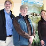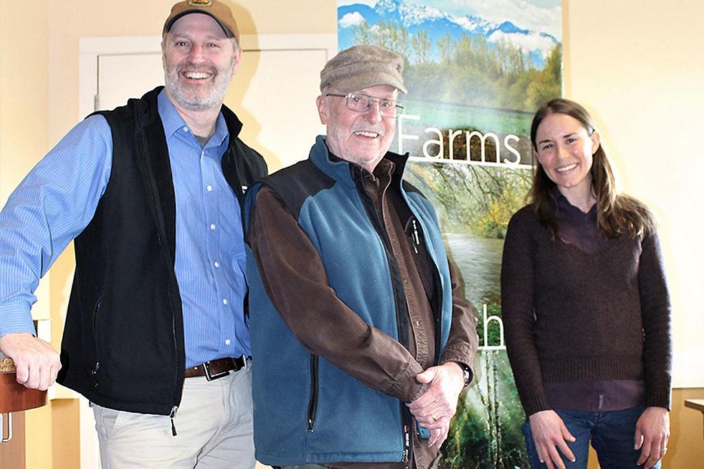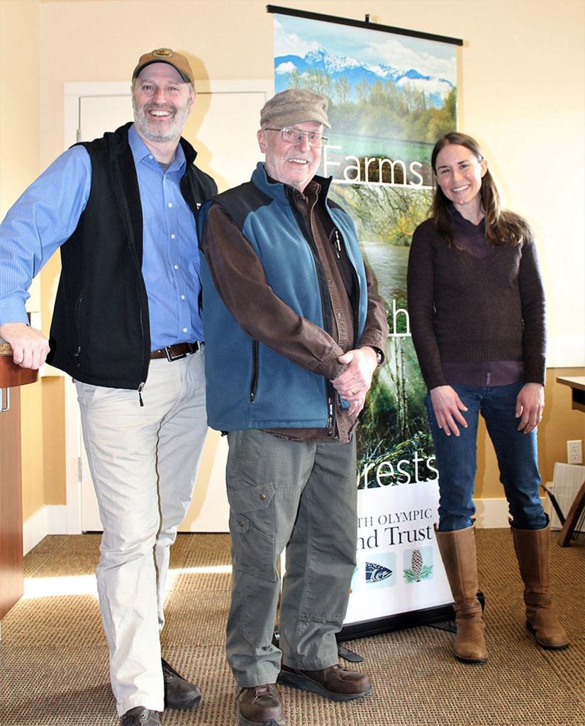 Sixty acres of long-farmed, fertile ground within the Sequim-Dungeness Valley is no longer at risk of being anything but a space for local agriculture. Steve Vause, landowner and president of the 159-year-old Historic Ward Farm’s group of stakeholders, signed the final document needed to confirm a conservation partnership with North Olympic Land Trust on Feb. 2. Although the farm came under contract for conservation in late November, the successful effort by Land Trust officials to conserve the farm, which is among the few large swaths of farmland remaining in Clallam County, was a multi-year process that relied on both state and community support. “The importance of local farmland is something we (farm’s stakeholders) all share,” Vause said. “It’s exciting to know this historic farm will always be available for agriculture.” From left are Tom Sanford, North Olympic Land Trust executive director; Steve Vause, landowner; and Michele Canale, North Olympic Land Trust conservation director. Photo by Alana Linderoth