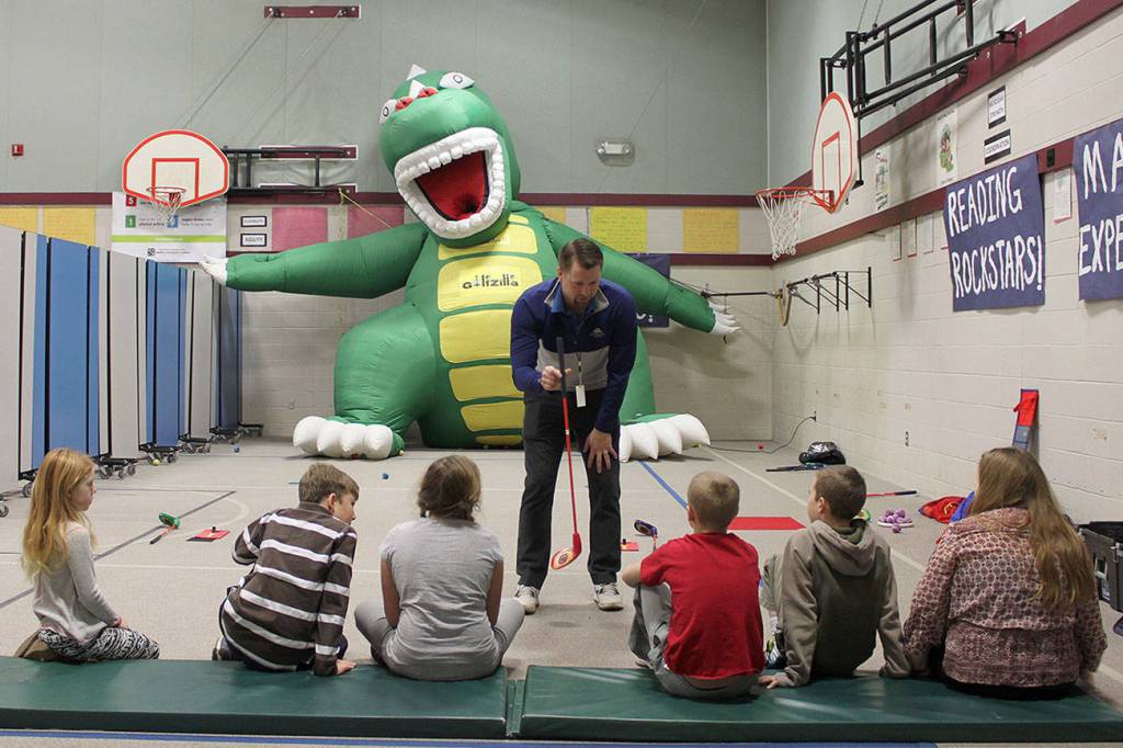 Golf pro Bill Shea from The Cedars at Dungeness is coordinating a series of golf instructional activities with teacher Doug Hastings to provide all students with a golfing experience. Golf pro peers Chad Wagner and Garrett Smithson are assisting. Activities during P.E. class included aiming for Golfzilla’s mouth, chipping into red containers and practicing putting.