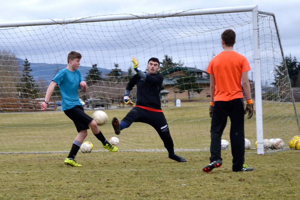 Sequim High School’s boys soccer squad preps for the 2017 spring season last week. In his 22nd year, head coach Dave Brasher looks to lead the Wolves back to the West Central District playoffs. Sequim went 8-4 and tied for second in the Olympic League last season. See a full team preview for boys soccer and other Sequim High’s other spring sports — baseball, fastpitch, boys and girls golf, girls tennis, track and field — in the March 15 edition of the Sequim Gazette.
