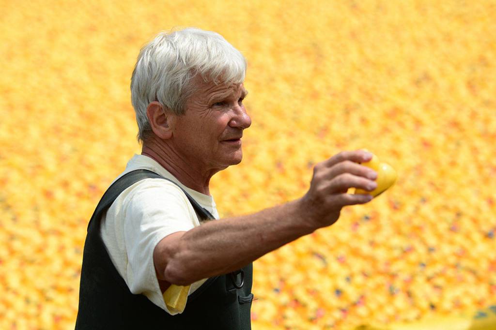 Thompson’s yellow rubber duck — one of more than 28,000 entered into Sunday’s 28th annual Great Olympic Peninsula Duck Derby — was the first to float over the finish line, earning Thompson a 2017 Toyota Corolla donated by Wilder Toyota of Port Angeles. The derby was at the Lincoln Park ponds.