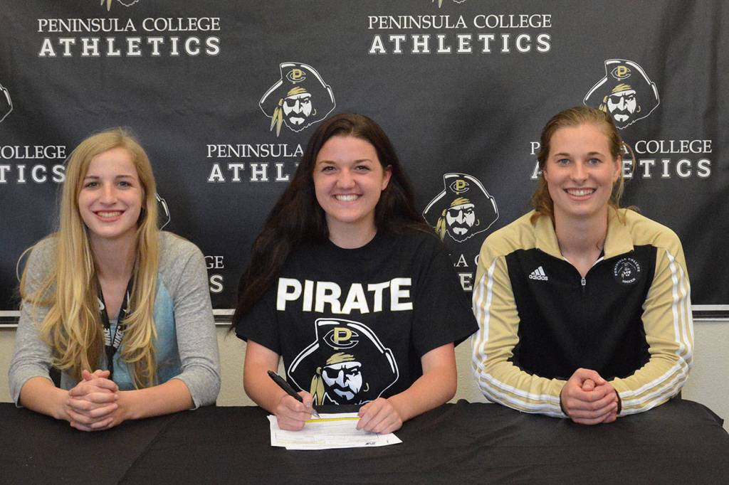 Sequim’s Erin Vig (center) in May signs a letter of intent to play at Peninsula College this fall. Joining her are, from left, Peninsula Soccer Academy coach Keith McMinn, all-Olympic League goalkeeper Claire Henninger, PC Pirate (and SHS graduate) Heidi Vereide and Sequim High head coach Derek VanderVelde. Photo courtesy of Peninsula College
