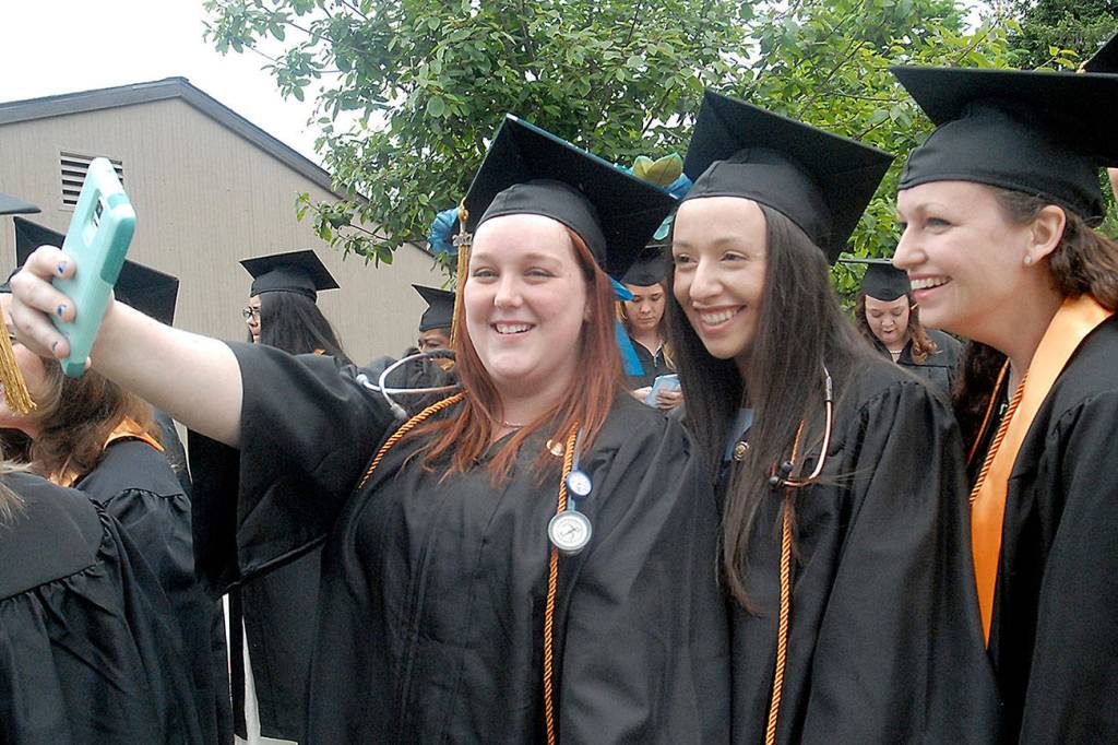 Nursing students, from left, Carrie Bertman of Port Angeles, Michelle Abell-Sietz of Sequim and Jessica Meek of Port Angeles pose for a group selfie while lining up for commencement ceremonies on June 17 on the Port Angeles campus of Peninsula College. A total of 275 students were set to take part in the proceedings out of 486 students receiving 600 degrees and certificates.