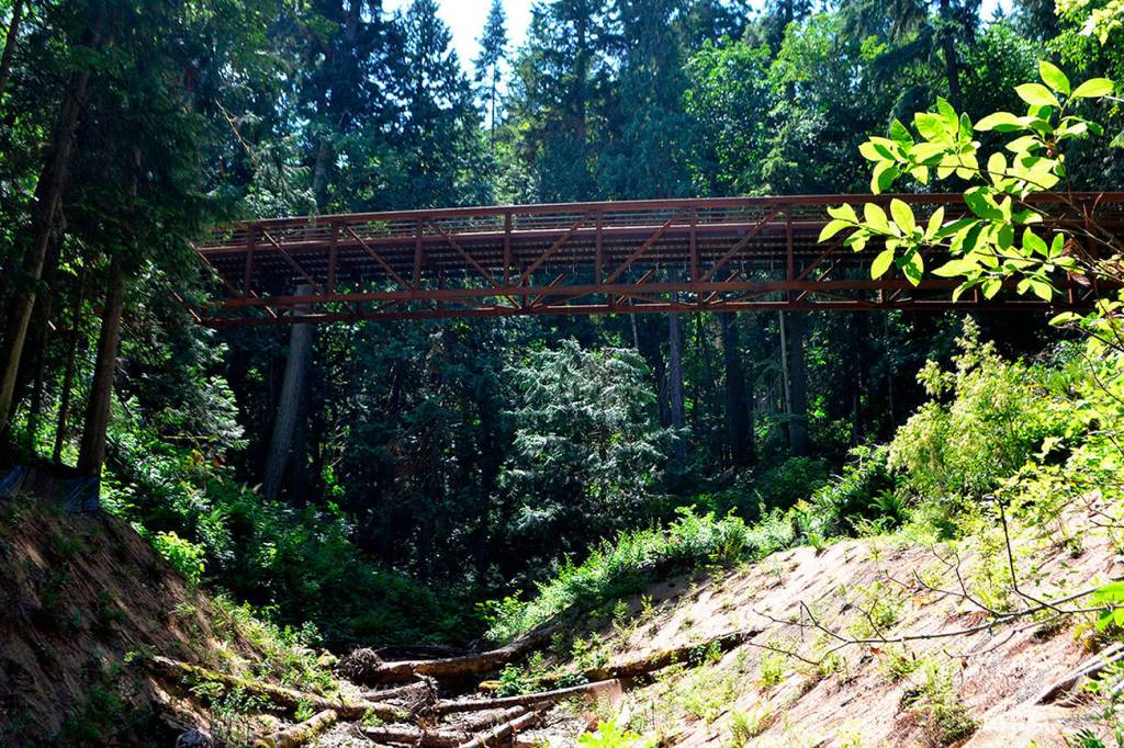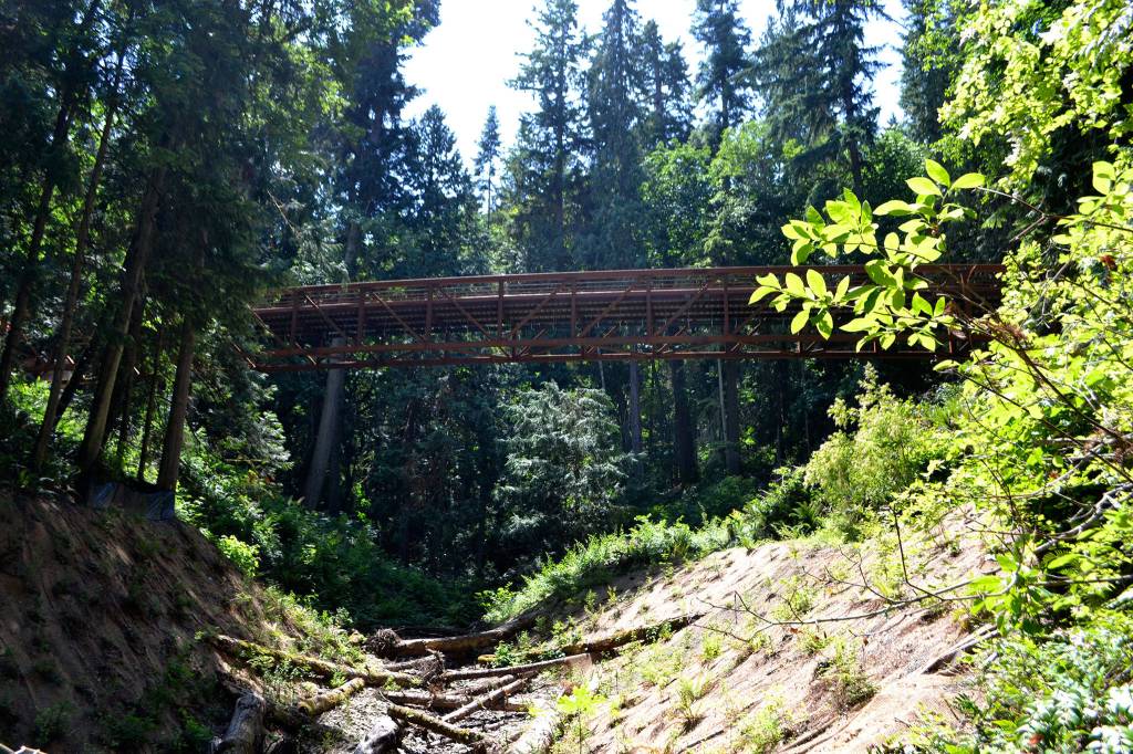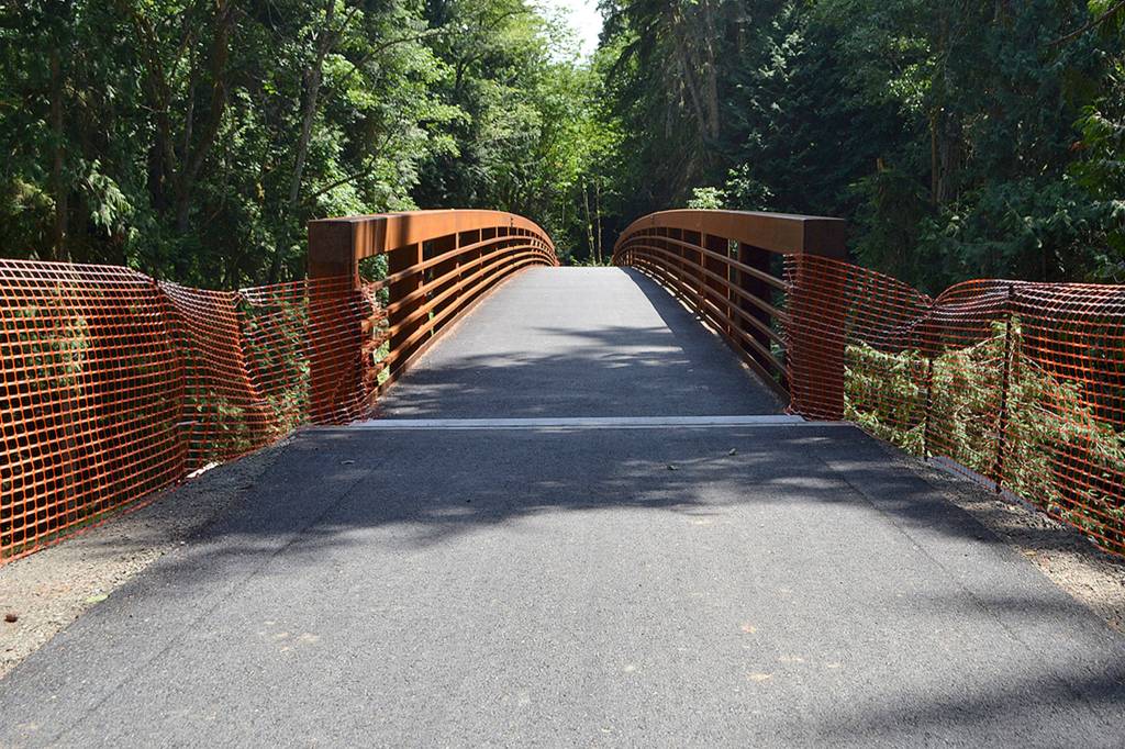 Crews with Nordland Construction moved the 177,000-pound bridge into place on Jan. 19 and it was connected with the Olympic Discovery Trail in May.