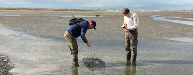 So far, 87 European green crab, an invasive species, have been captured in Dungeness Spit’s Graveyard Spit channel and lagoon. Here volunteers Karl Pohlod, Mark and Terri McClelland, and Lorenz Sollmann, deputy project leader at the Washington Maritime National Wildlife Refuge, stand near a trap in June. Photo courtesy of Allen Pleus, Washington Department of Fish & Wildlife