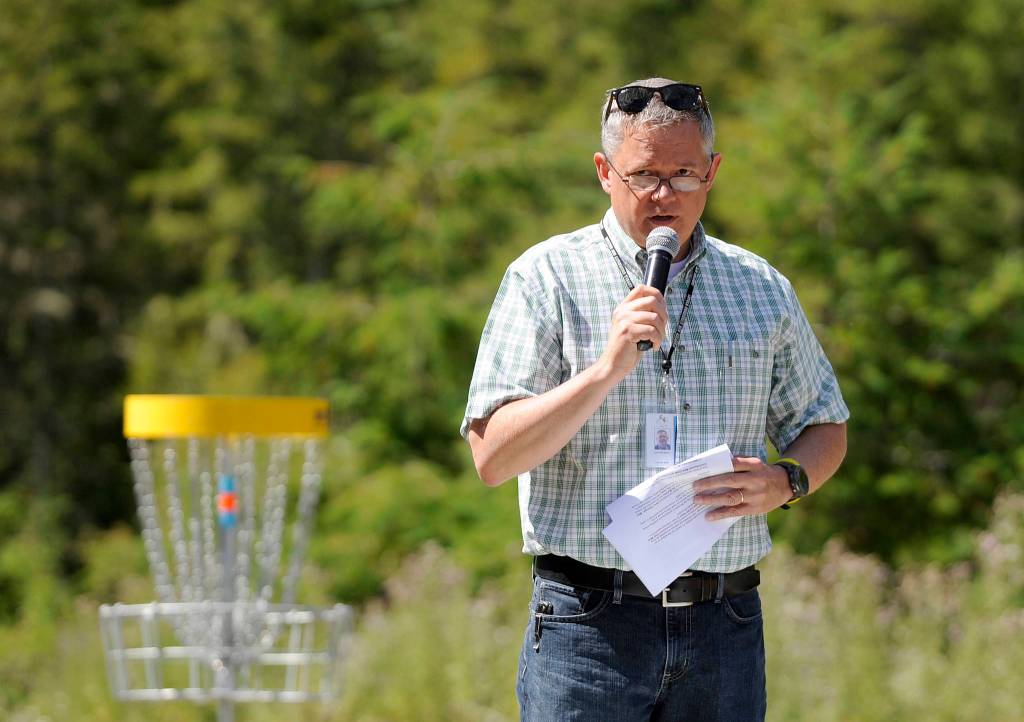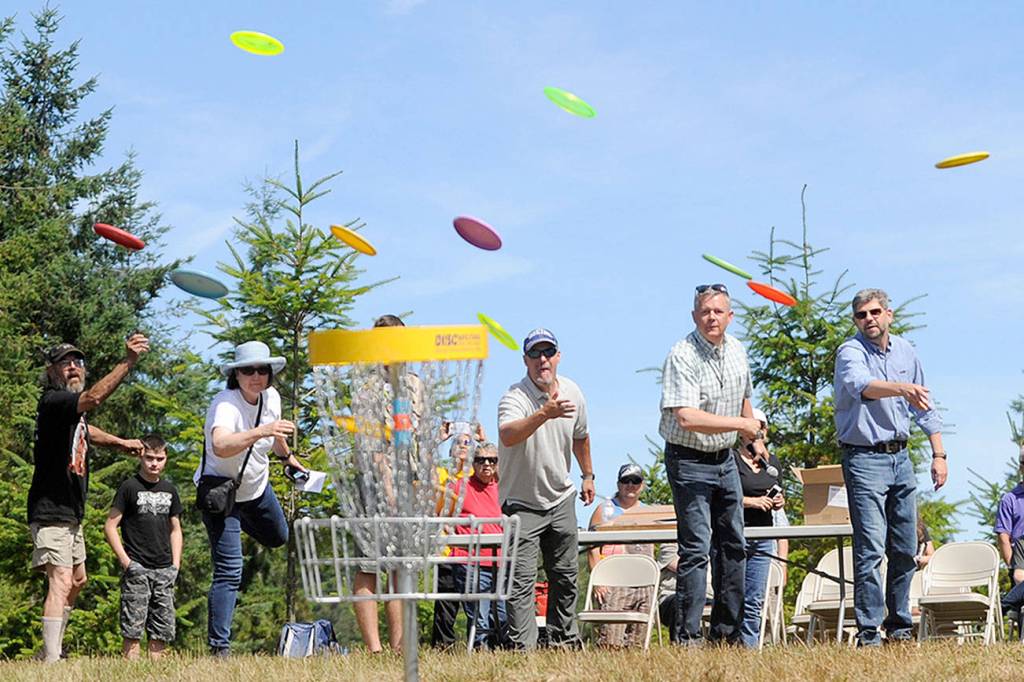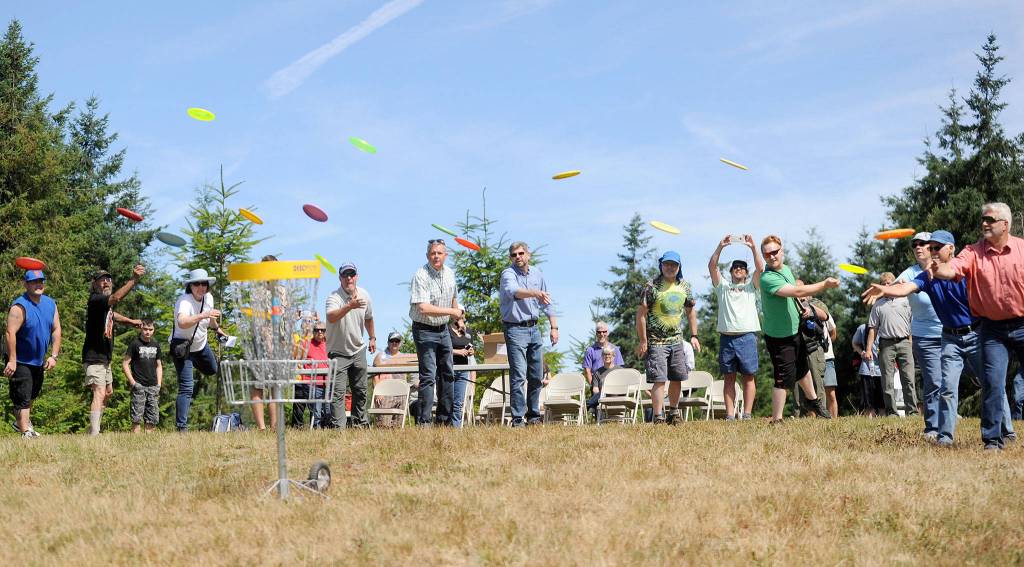 Winborn, the Clallam County parks, fair and facilities director, and a group of disc golf proponents cast their plastic gliders at a metal basket on July 26 to mark the official dedication of the Rainshadow Disc Golf Park near Blyn.