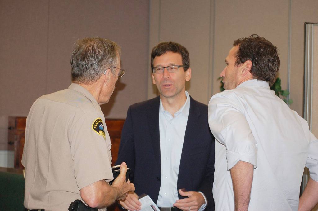 Washington State Attorney General Bob Ferguson, center, talks with Clallam County Sheriff Bill Benedict, left, and Rotary members after the Sequim Sunrise Rotary meeting on Friday, Aug. 18, where he stopped to pay a visit on his way to the ceremony naming the Daniel J. Evans Winderness at Hurricane Ridge. Sequim Gazette photo by Erin Hawkins