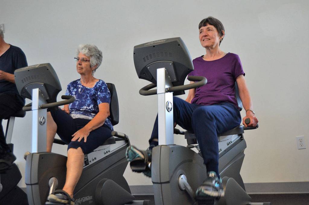 Mary Farley of Sequim and Linda Flores of Port Angeles cycle at the YMCA of Sequim on Aug. 28 during a workout with the Exercise and Thrive program. Sequim Gazette photo by Matthew Nash