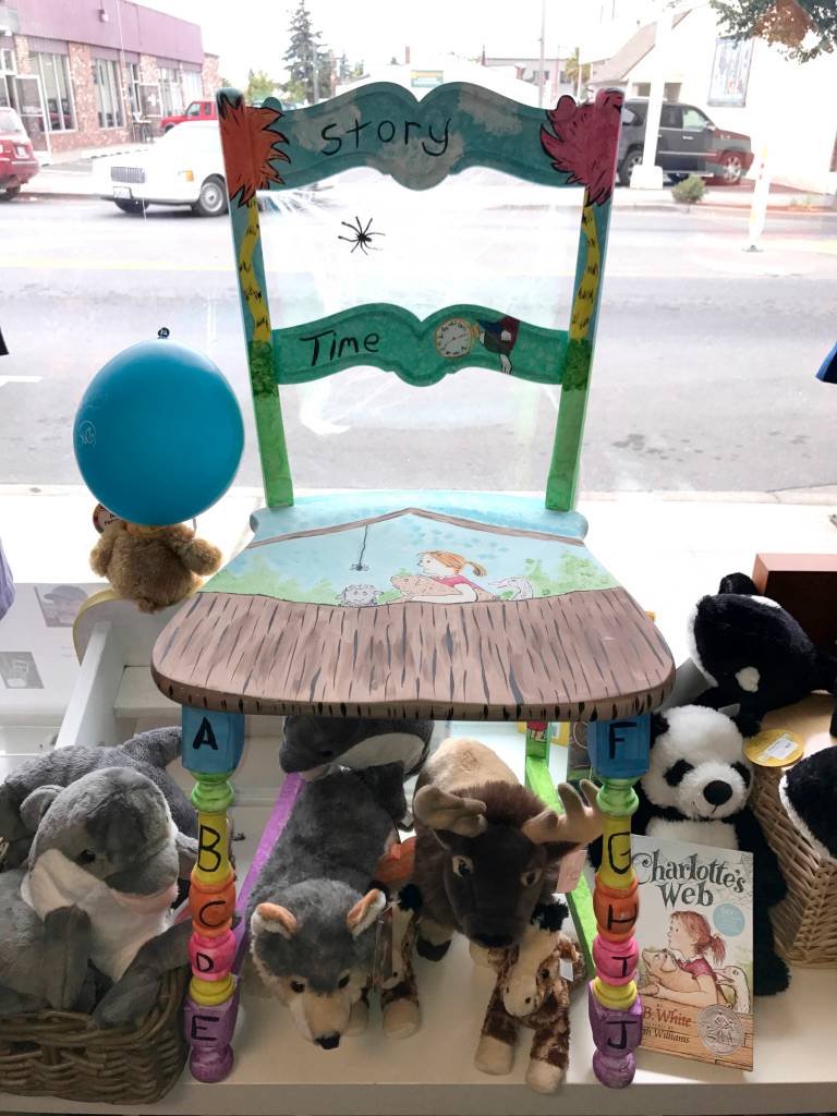 Kevin James’ “Charlotte’s Web” artistic chair sits in the window of Dungeness Kids Co. located at 163 W. Washington St. in Sequim.                                 Sequim Gazette photos by Erin Hawkins