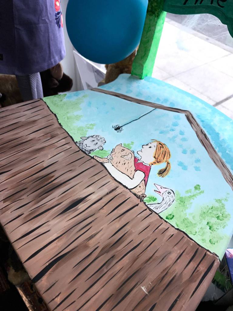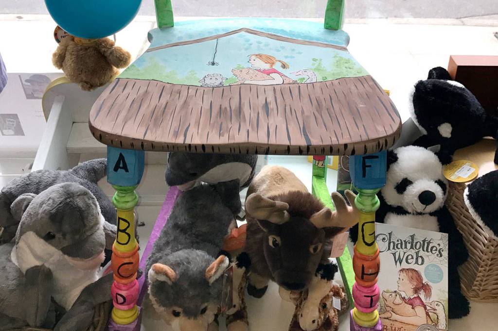 A close-up of artist Kevin James’ “Charlotte’s Web” inspired chair that sits in the window of the children’s retail store Dungeness Kids Co. at 163 W. Washington St. in Sequim. Sequim Gazette photo by Erin Hawkins