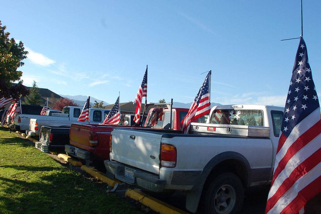 At least 15 cars displaying American flags were backed into the Sequim High School parking lot facing North Sequim Avenue during the school day on Oct. 31. The large display was organized by Sequim High School senior Garrett Wehr and other students from the Sequim High School Class of 2018 and a few juniors. “The students of SHS love their country and are proud of it, and aren’t afraid to show it,” Wehr said. Many cars pulled over on North Sequim Avenue on Oct. 31 to take photos of the display.