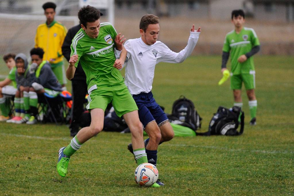 Storm King’s Ryan Tolberd (center) breaks through the Seattle United South (Blue) defense to set up the third Storm King goal in a key 3-1 win at the Albert Haller Playfields on Nov. 12.