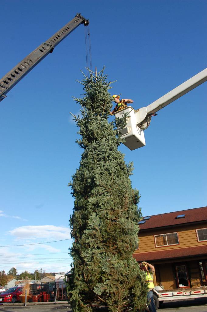 The holiday season is in the air — literally — as a 35-foot noble fir was lifted and installed at the corner of East Washington Street and North Sequim Avenue on Nov. 15. First Federal Bank sponsored the tree, Accurate Angle volunteered its crane to lift the tree and the City of Sequim picked up the tree from Bacon’s Christmas Tree Farm in Bremerton. Sequim residents Emily Westcott, “Captain” Crystal Stout, Shenna Younger and her daughter Kaylee Straling picked out the tree for the Sequim community.