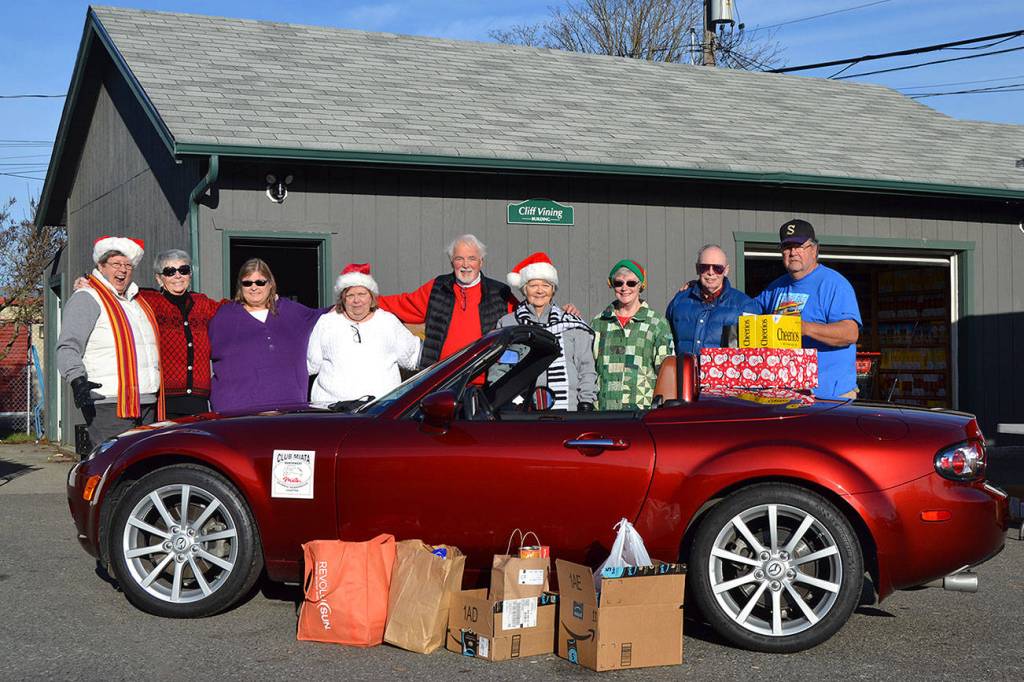 Olympic Peninsula Chapter of Club Miata Northwest members gather with Stephen Rosales, board president of the Sequim Food Bank, around Vicki Burr-Chellin’s 2008 Miata MX5 for a donation on Dec. 14 of $350 and several boxes of food. Sequim Gazette photo by Matthew Nash