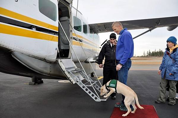 Dick Pattee takes Gilla, a guide dog in training, onto an airplane via Kenmore Air at William R. Fairchild International Airport. Photo courtesy of Puppy Pilots