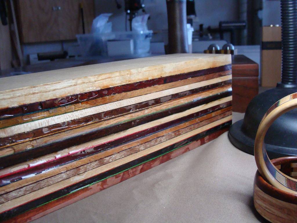 She’ll laminate 12-13 different species of hardwoods with each piece 1/4-inch by 3.5 inches by 16 inches long.