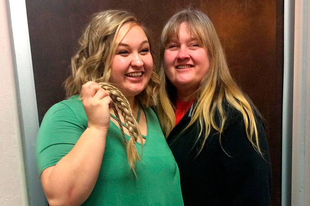 Sequim grad Victoria Hall recently had more than a foot of her hair cut off to help create a wig for her mom Robin who is receiving chemotherapy. Victoria, Robin and another relative’s hair will help make the wig. Photo courtesy of the Hall Family