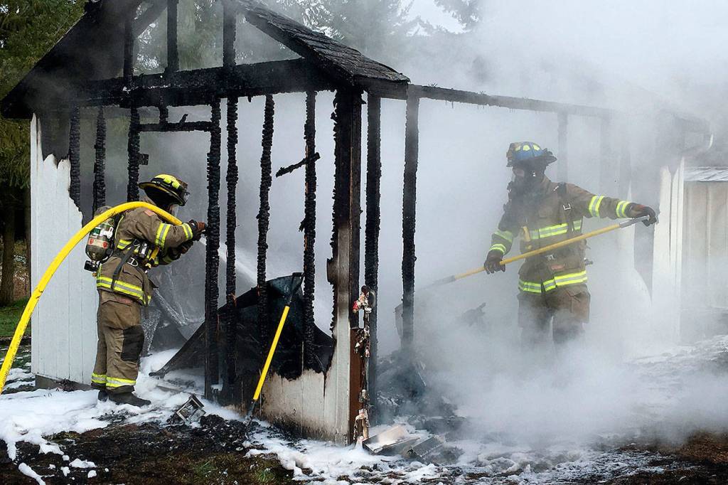 Officials with Clallam County Fire District 3 are considering a general levy lid lift for voters to consider this year to prevent deficit spending in 2019. Emergency calls to fires like this shed fire last March near Taylor Cutoff Road make up about 14 percent of calls for the fire district along with vehicle wrecks, hazardous spills, and technical rescues. Sequim Gazette file photo by Matthew Nash