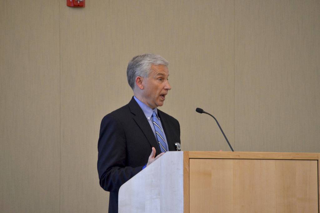 Eric Lewis, CEO of Olympic Medical Center, speaks with Sequim City Councilors on May 14 in a work session about the center’s expansion plans in Sequim, including the Cancer Center and more primary care exam rooms. “We need more buildings and physicians and having adequate primary care access would really move the system forward,” he said. Sequim Gazette photo by Matthew Nash