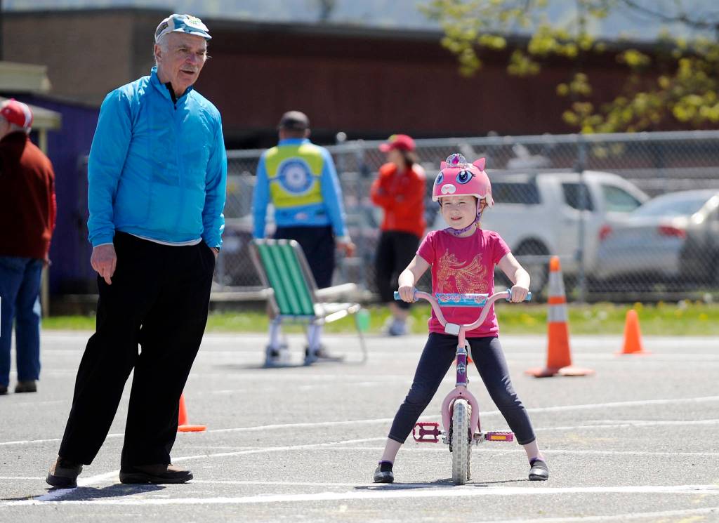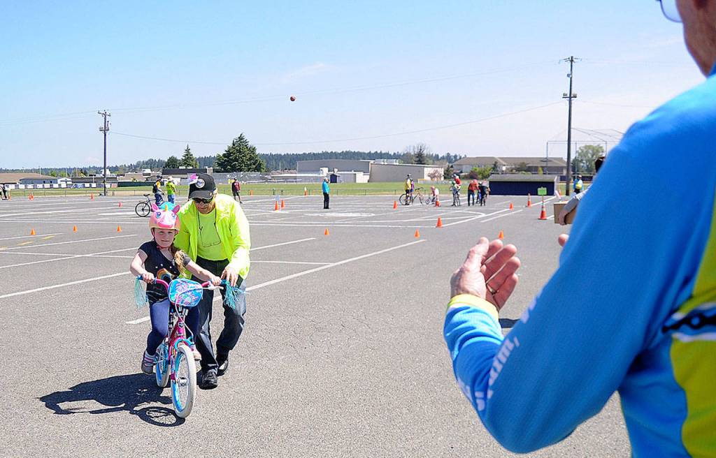 “One of our goals is to get them off their training wheels,” sais Brian Watson, a bicycle instructor from Bremerton who designed the course. “(This is) designed to sequentially build their bicycle skills,” he said — likening riding a bicycle to driving a vehicle.