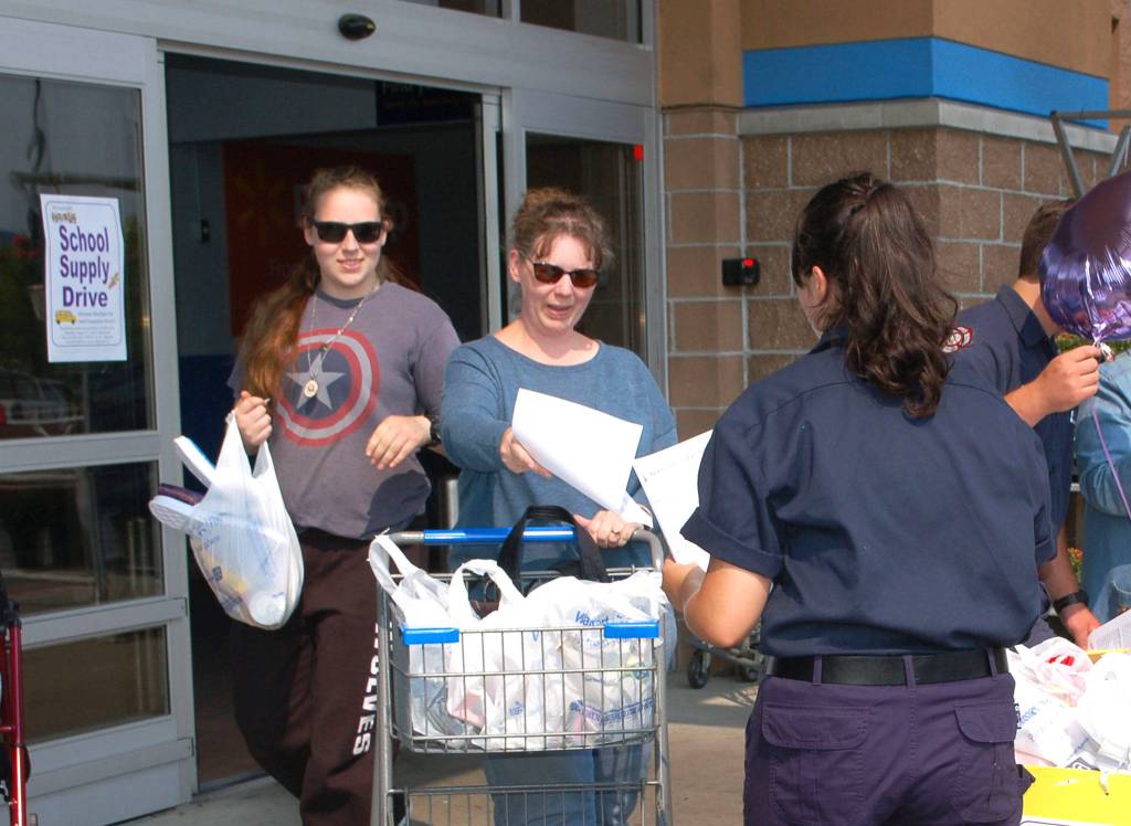 Sequim High School student Bailey Cauffman, left, and her mother Shannon Cauffman, a Greywolf Elementary School employee, hand back a back to school school supply list to volunteer Anna Fallon, from the 1003 explorer program, and donate a few bags of supplies from the Sequim Walmart as part of the “Stuff the Bus” event on Aug. 10. Supplies will be donated to Sequim Schools’ students from low-income families who are not able to provide his or her children with supplies. Sequim Gazette photo by Erin Hawkins