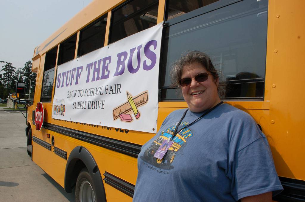 Vienna Barron, a school bus driver for Sequim School District stands with the bus at the “Stuff the Bus” school supply drive on Aug. 10. Sequim Gazette photo by Erin Hawkins