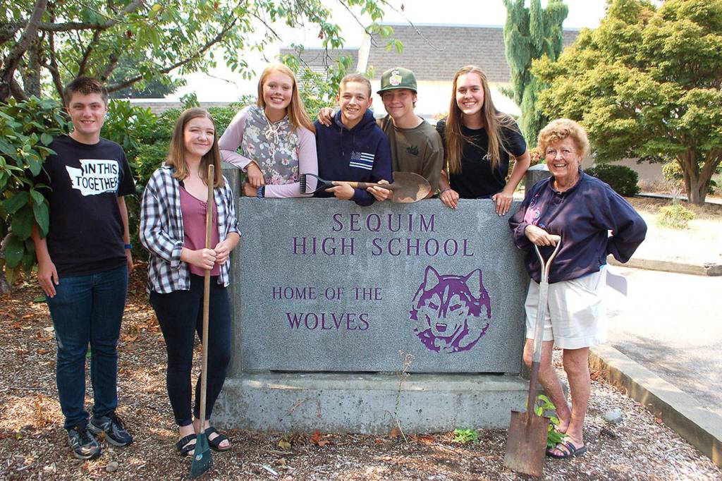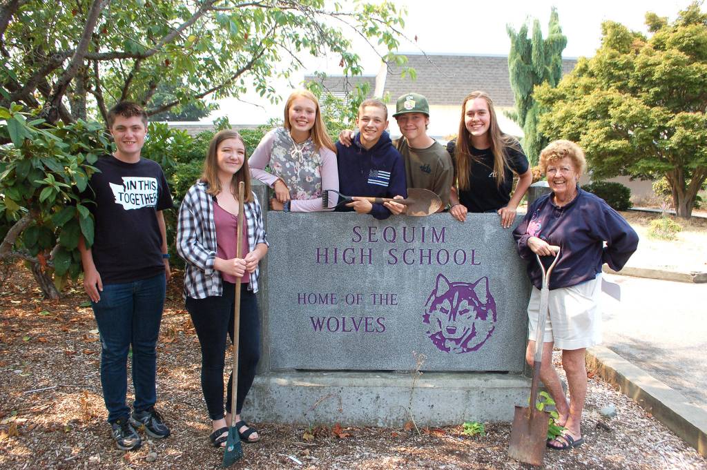 Students and volunteers are gearing up to provide a campus cleanup of Sequim High School from 8 a.m.-3 p.m. on Saturday. Aug. 18. From left, Sequim High School students Liam Braaten, Payton Sturm, Emily Bundy, Nicholas D’Amico, Hunter Wells, Katie Potter and volunteer Emily Westcott go over details of this weekend’s cleanup. Westcott says volunteers will meet in the high school parking lot, can volunteer for any amount of time he or she would like and beverages and snacks will be provided. Sequim Gazette photo by Erin Hawkins