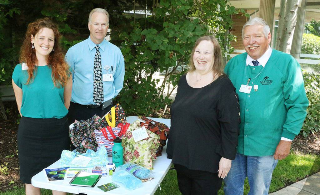 Olympic Medical Center Auxiliary volunteers assemble and donate hand-crafted “Comfort Bags” for cancer patients. The bags are filled with a variety of items that are donated by the auxiliary, local businesses and individuals. Pictured, from left, are patient navigator Mikel Townsley and Dean Putt, director of the cancer program, with OMC Auxiliary board member Sandy Hutter, OMC Auxiliary board member and OMC Auxiliary president Leif Olson. For more about the OMC Auxiliary, see www.olympicmedical.org/default.aspx?ID=130, or contact Volunteer Coordinator Kathy Coombes at 360-565-9110 or kcoombes@olympicmedical.org. Submitted photo