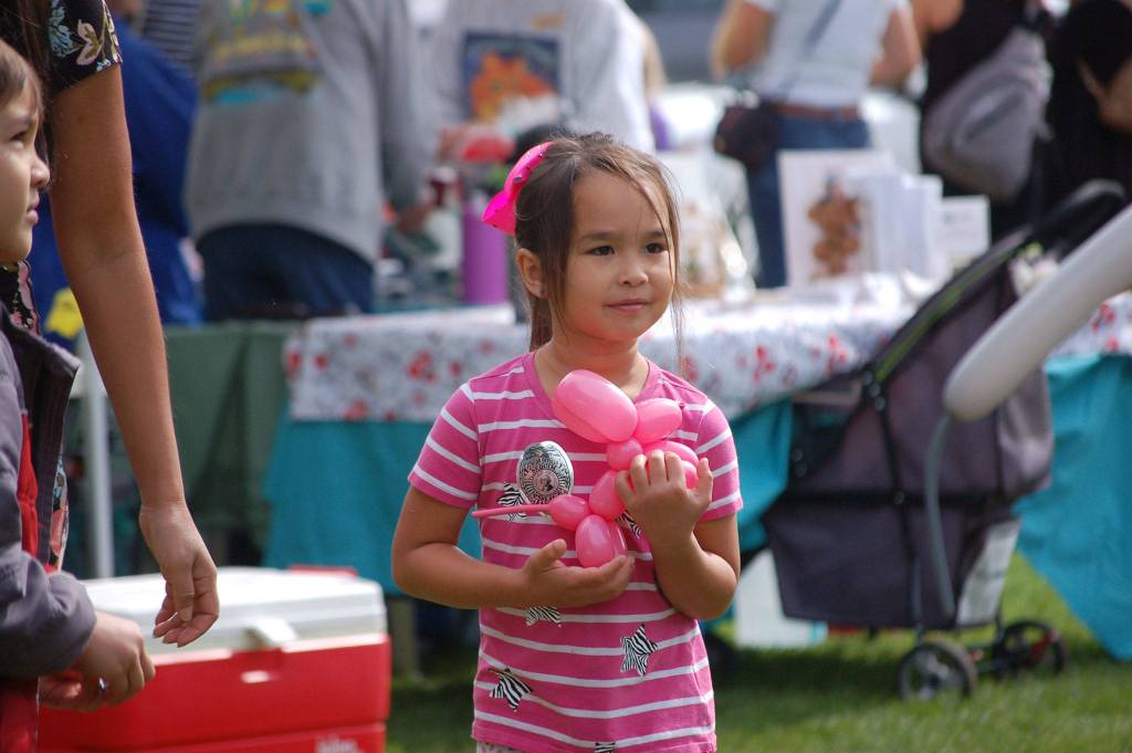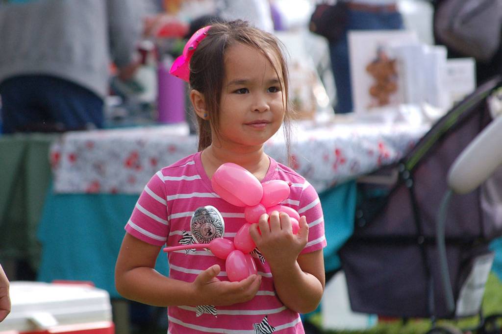 Isabella Greimes, 6, of Sequim, holds a balloon animal in the shape of a dog at the Sequim Dog Park’s 11th-annual birthday celebration at Carrie Blake Park.