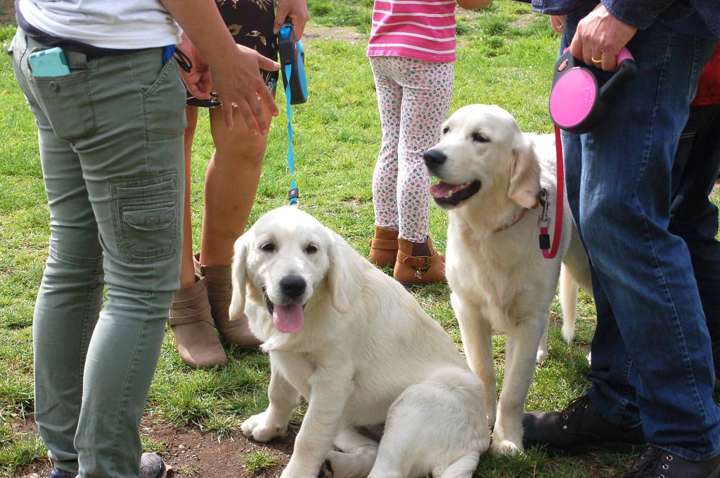 Two English creme golden retrievers, Kiera and Sasha, receive plenty of attention at the Sequim Dog Park’s 11th-annual birthday celebration on Sept. 8 at Carrie Blake Park. Sequim Gazette photos by Erin Hawkins