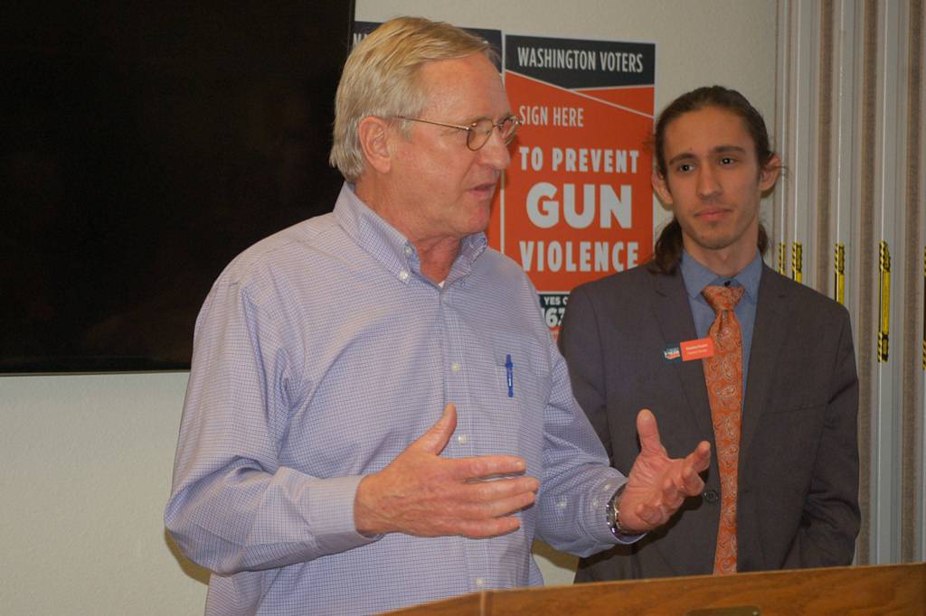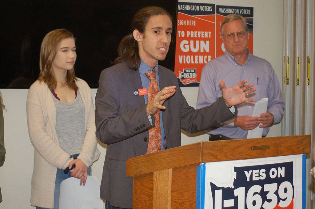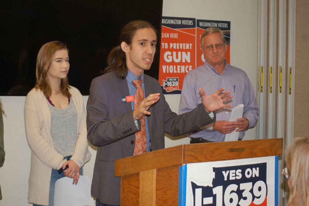 Stephen Paolini, campaign manager for “Yes” on Initiative 1639, center, with Port Angeles High School student Raven Sharpe and State Rep. Steve Tharinger (D-Port Townsend) looking on, addresses a crowd of supporters at the Sequim Library on Sept. 24. The initiative is a “comprehensive gun violence prevention measure” that will change the age to purchase semi-automatic assault rifles from 18-21, creates an enhanced background check to purchase semi-automatic assault rifles, creates secure storage practices, and makes buyers aware of risks associated with firearms. The measure goes to the General Election ballot on Nov. 6. Sequim Gazette photo by Erin Hawkins