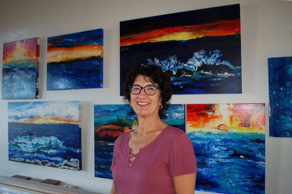 Many of the scenes in her artwork include sunsets, ocean scenes, and some of her favorite marine animals such as whales.