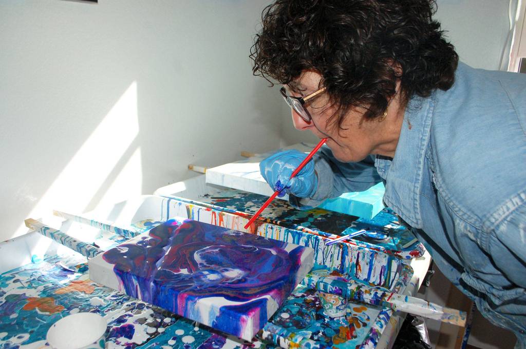 When she pours, Burns starts by choosing colors she wants to work, then creates a pour mixture using acrylic paint and chemicals, such as a few drops of silicone, that helps the paint move and flow when she pours it onto her canvas.
