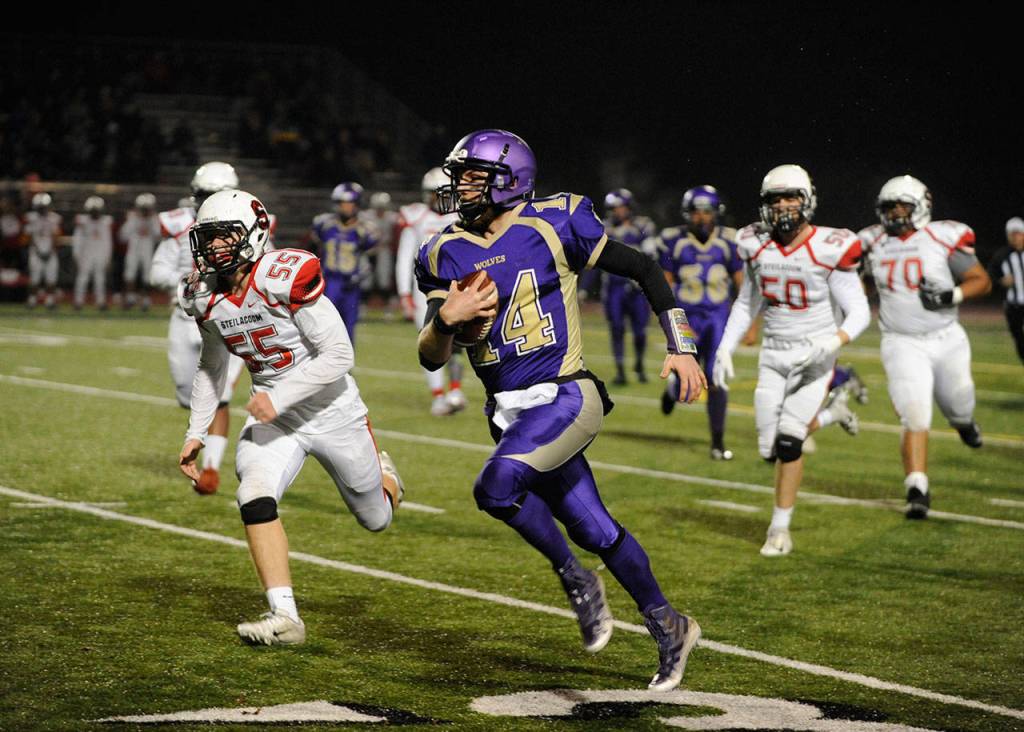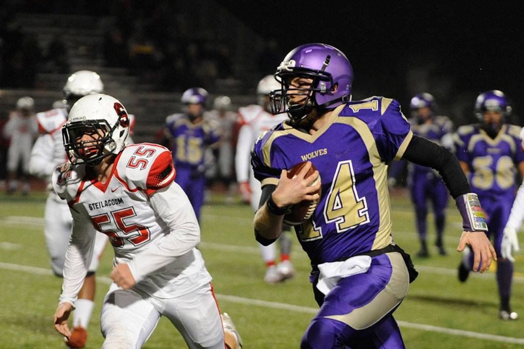 Sequim safety Taig Wiker intercepts a pass from Steilacoom quarterback J.J. Lemmings in the first quarter of the Wolves’ state 2A tournament game on Nov. 9. Photo by Carmen Kahulumealani Barton