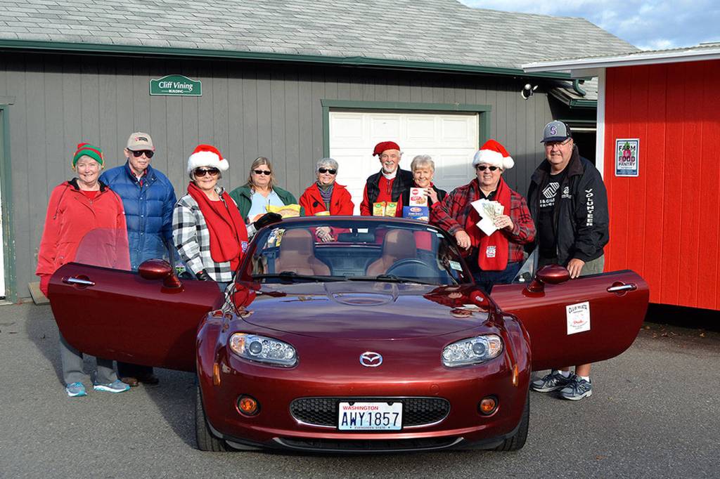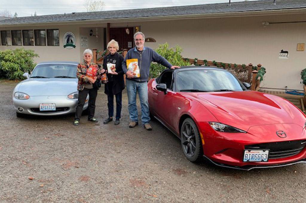Looking sporty while giving back, members of the Olympic Peninsula Chapter of Club Miata Northwest once again followed their annual Christmas luncheon with dropping off donations to local organizations.
