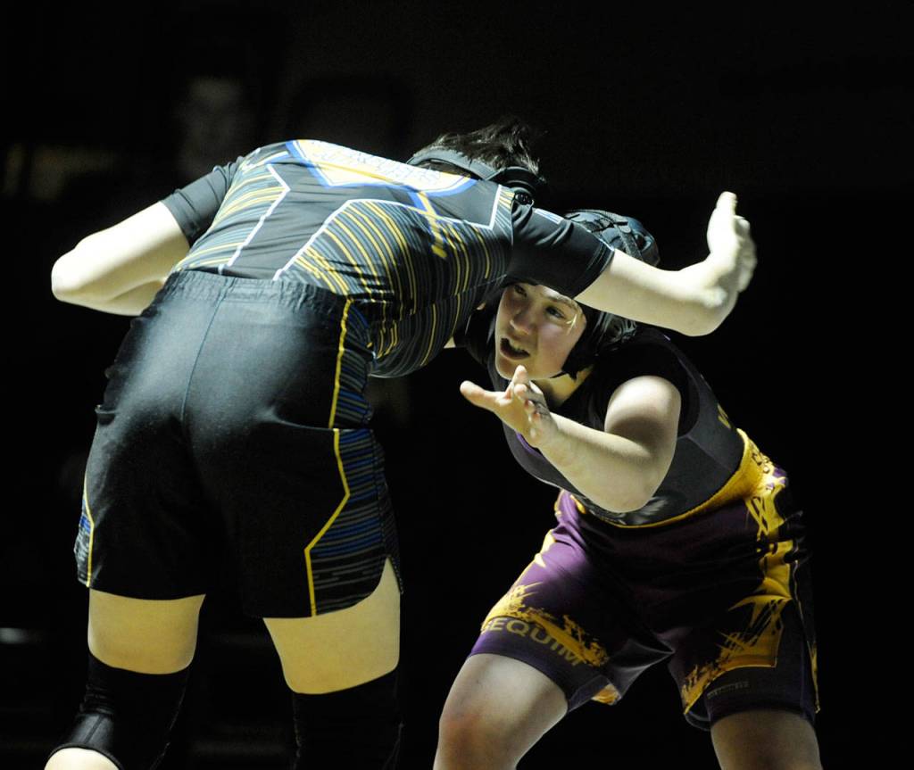 The match also saw a couple Sequim-versus-Port Angeles matches: In the 123-pound weight class, Sequim’s Lilly Peterson pinned PA’s Trinity Laws in the first period, while Sequim’s Brooke Hodges was pinned by Port Angeles grappler Kayla Richmond in the third period.