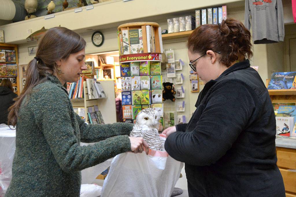 Jenna Ziogas, education coordinator for the Dungeness River Audubon Center, and Gabrielle Genhart-Stiehler, an Americorps volunteer, wrap a snow owl in a plastic bag prior to it going into a freezer truck on Jan. 24 to prevent the drugstore beetles from spreading onto it and other taxidermy animals in the center. Sequim Gazette photo by Matthew Nash