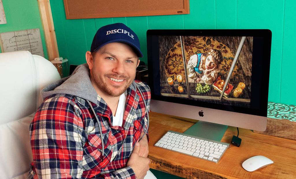 His rural Port Angeles studio is sparse, and a powerful laptop, a 24-inch MacBook Pro and a Canon EOS 80D digital camera are the tools of his trade with which he makes magic.