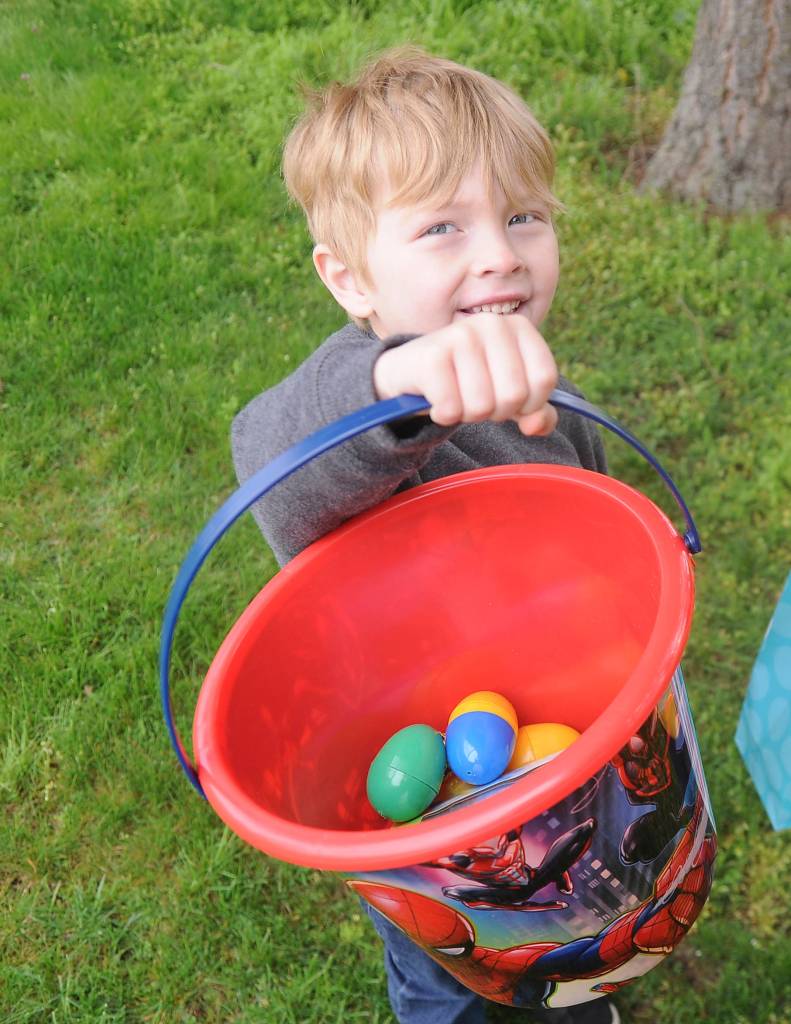 Adrian James, age 4½, shows off quite a haul at the Sequim Elks Lodge Easter Egg Hunt on April 20. Sequim Gazette photo by Michael Dashiell