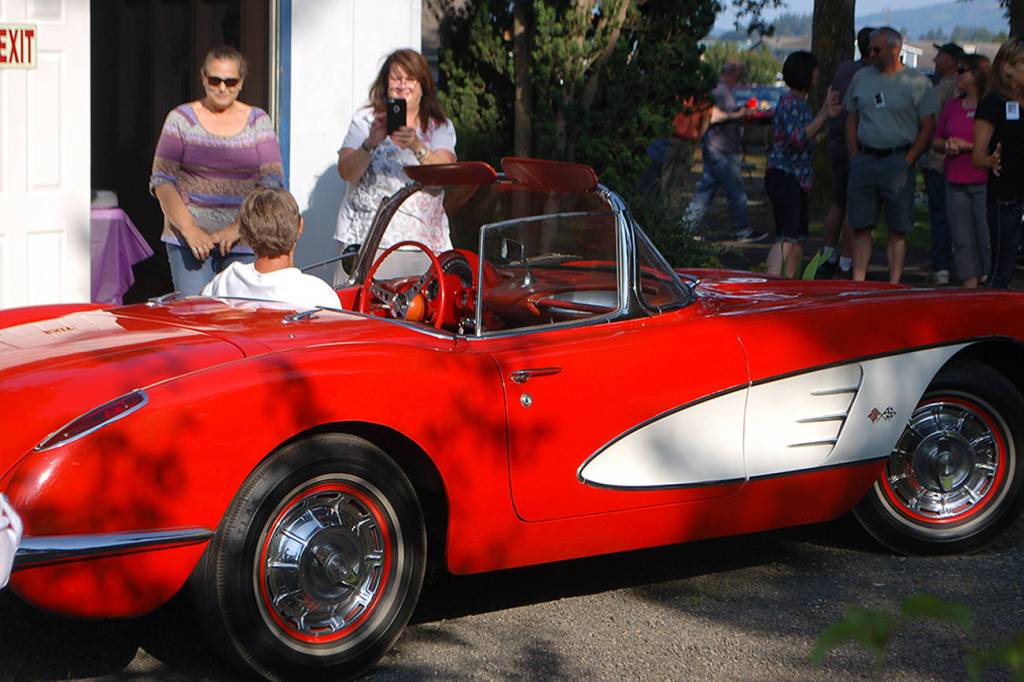 Shelli Robb-Kahler, center, takes a picture of one of her classmates from the Sequim High School class of 1979 sitting in her family’s 1956 Corvette at the 40 year reunion of the class.