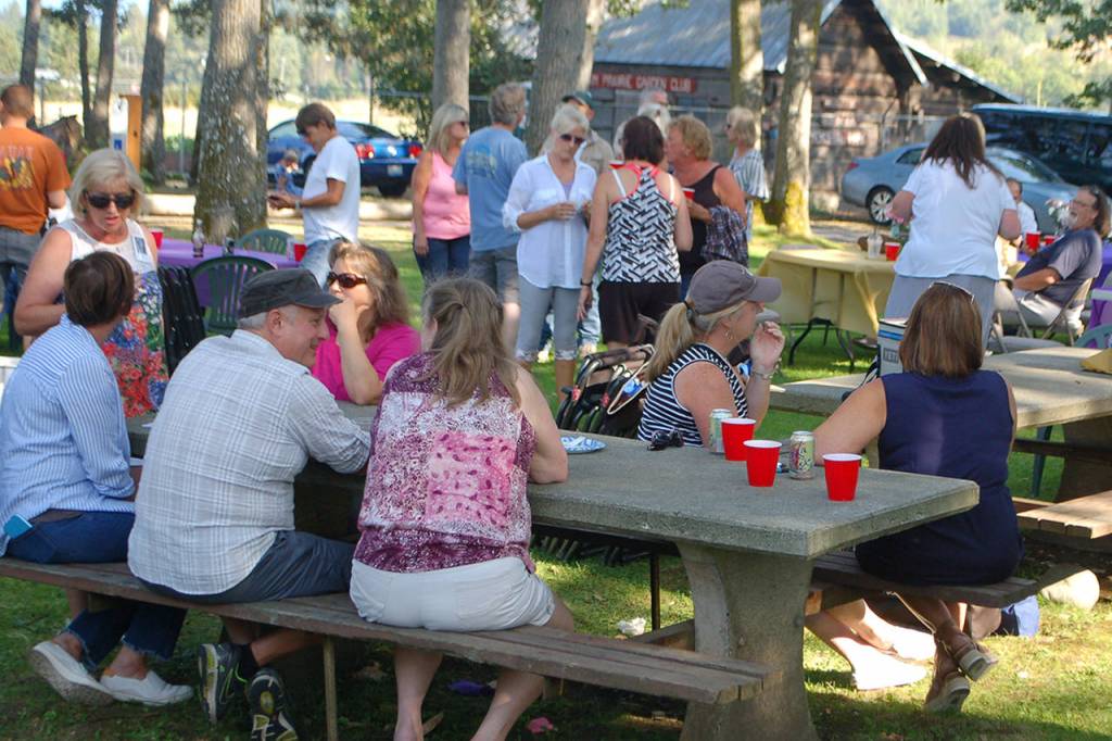 The Sequim High School class of 1979 eat and talk and share stories at their 40 year reunion at Pioneer Park on Aug. 3.